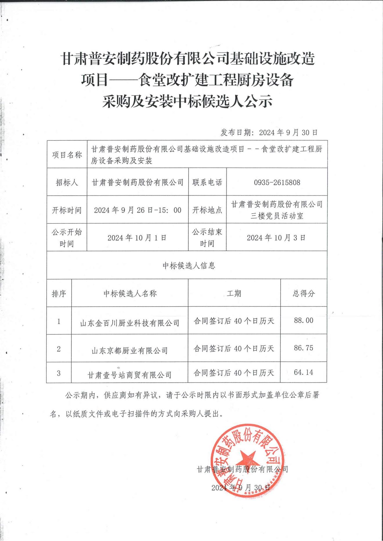 甘肅普安制藥股份有限公司基礎(chǔ)設(shè)施改造項(xiàng)目--食堂改擴(kuò)建工程廚房設(shè)備采購(gòu)及安裝中標(biāo)候選人公示