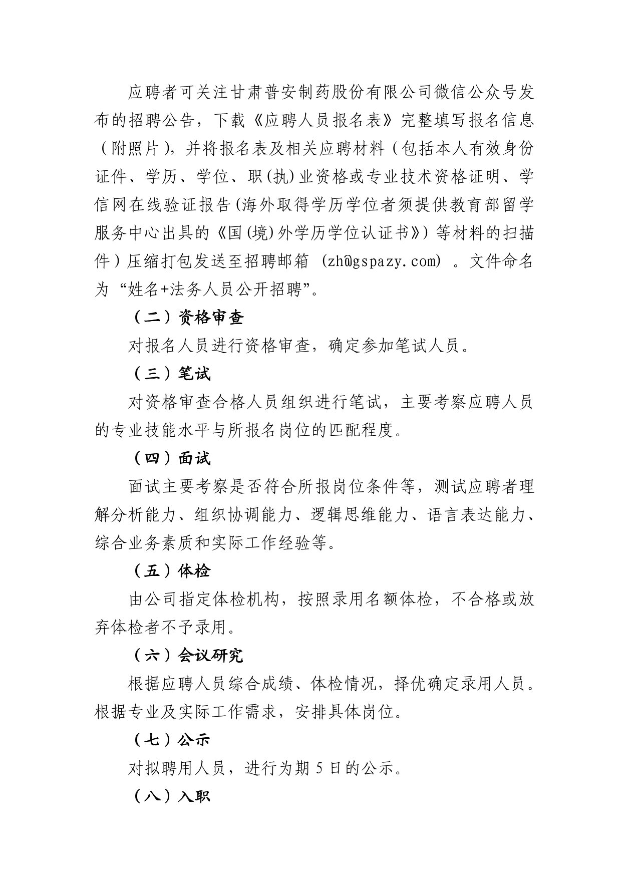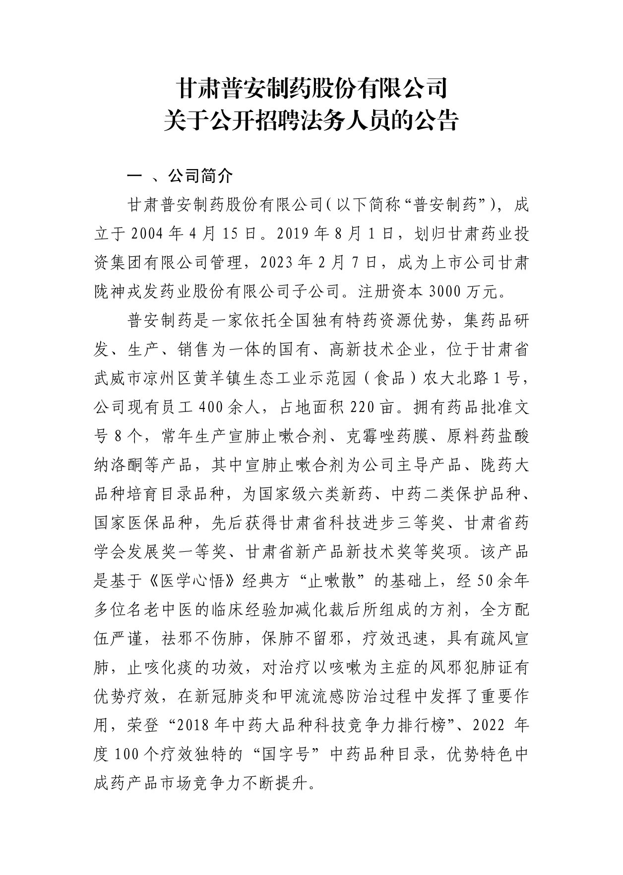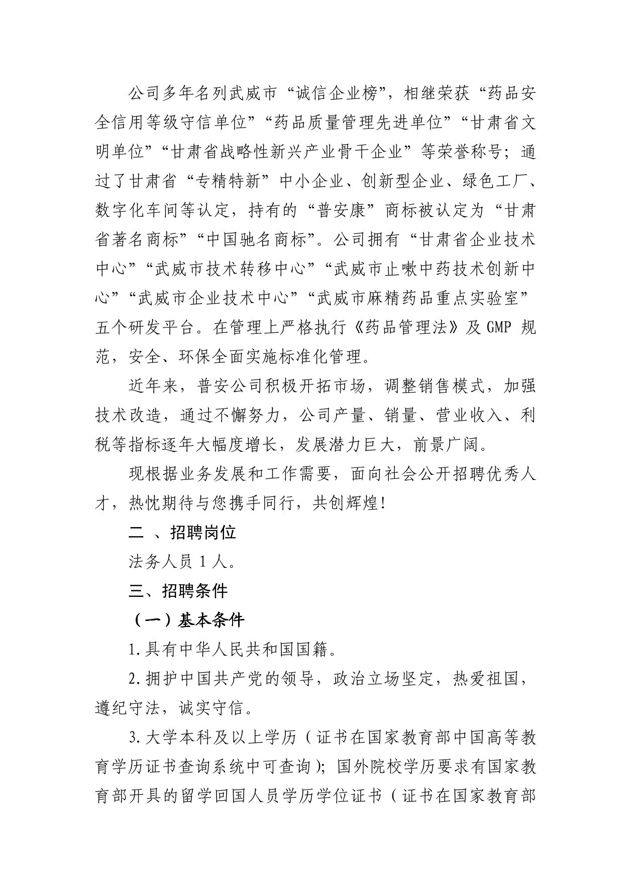 甘肅普安制藥股份有限公司 關(guān)于公開招聘法務(wù)人員的公告